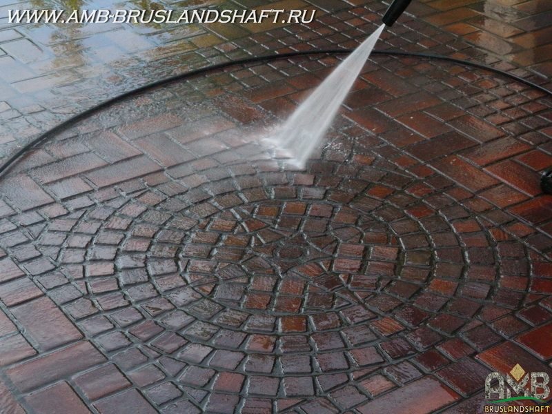Чистка тротуарной брусчатки давлением воздуха Компрессионная чистка тротуарки Можно ли воздухом высокого давления отчистить тротуарную брусчатку Если вы решились использовать именно такой метод чистки брусчатки компрессором, то мы бы его не рекомендовали. Советуем использовать мойку, например Керхер. Метод «струей воды под напором» считается самой лучшей очисткой от грязи для мощения, особенно, если это клинкерная или гранитная брусчатка или плитка. Использование компрессора выглядит очень странным и непрактичным вариантом для удаления грязи с больших площадей. Также, компрессор не имеет свойства рассеивания давления, как, например, моечная машина, которая захватывает большие площади и не может навредить мощению или отслоению верхних слоев у слабо пористой брусчатки в отличии от компрессора. Вода под сильным напором отмывает не только грязь, но и уводит ее вместе с водой в заданном и нужном вам направлении. Обратите внимание на картинки, как мы моем мощение водой с помощью машин высо