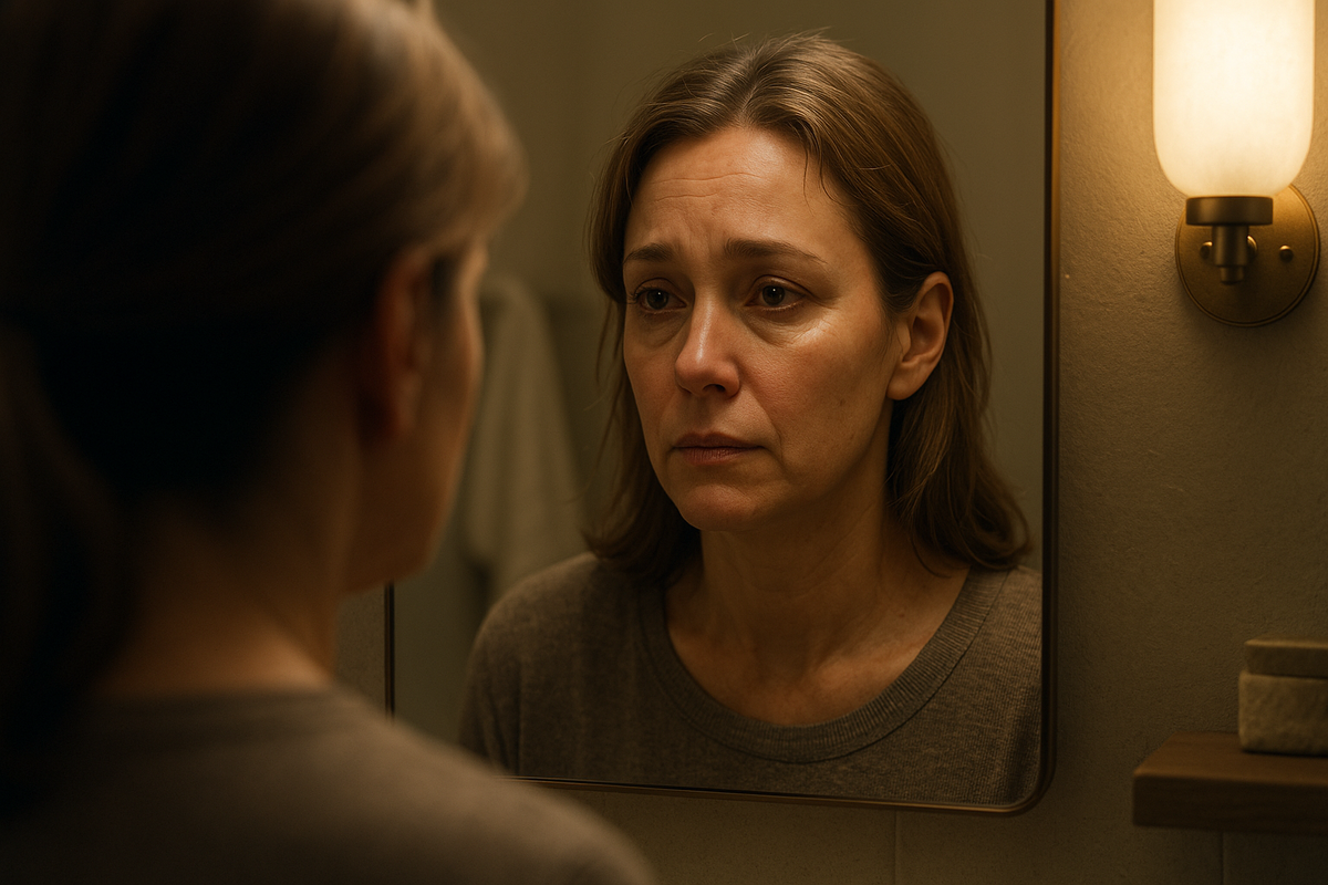 Женское лицо крупным планом. Без макияжа. С заметными следами усталости, с тонкими морщинками около губ. Глаза — как открытое окно: в них было всё сразу — и грусть, и мягкость, и какая‑то тёплая честность.