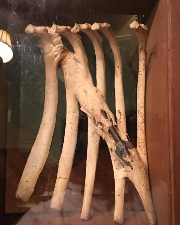 Дикая история из лихих 1970-х. На снимке, сделанном Робертом Стегаллом (Robert Stegall) из Юты, показаны ребра оленя с вросшей стрелой. Отец Роберта подстрелил животное во время охоты в середине 1980-х гг. И уже потом обнаружил стрелу в его ребрах. Как полагают ученые, осмотревшие останки оленя, дело было так. Животное пережило ранение стрелой за 9-10 лет до своей смерти. Видимо, какой-то охотник попал в оленя, но не смог его догнать. Животное не погибло и смогло уйти. Ребра были сломаны, но за время заживления кость начала нарастать вокруг стрелы. Фактически стрела сыграла роль шины, вокруг которой срослись ребра. Вот такая тяга к жизни!