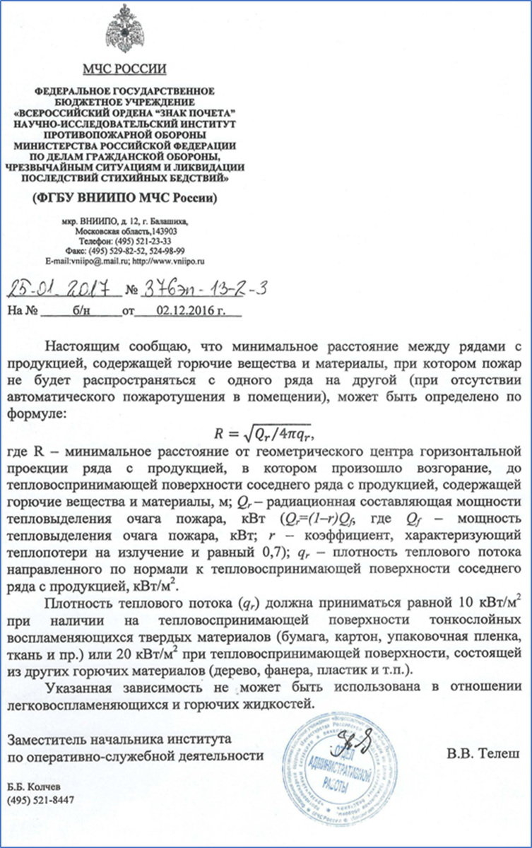 В данной статье представлено следующее письмо от ФГБУ ВНИИПО МЧС России, в котором предлагается оценивать расстояния между единицами пожарной нагрузки R, при которых не происходит распространение пожара между ними: