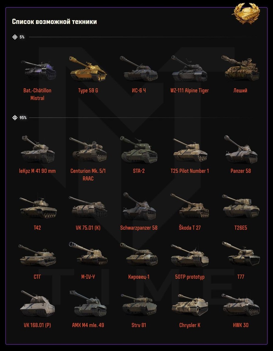 Чёрный рынок возвращается в Мир танков! С 19 ноября, 9:00 МСК – готовьтесь к охоте за редчайшими танками в Чёрном гараже! В этот раз в ангар могут попасть: * Mistral * Type 59 G * ИС-6 Ч * WZ-111 Alpine * Леший Шанс выловить жемчужину – всего 5%! Рискнёте испытать удачу и пополнить свою коллекцию уникальной машиной?