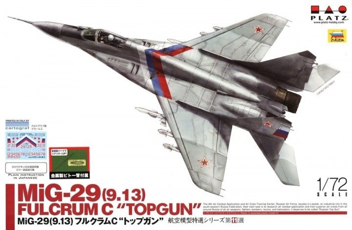 Японская Platz очередной раз перепаковывает модель МиГ-29 в масштабе 1/72 разработки 2015 года от "Звезды" теперь с добавлением фототравления и латунной штанги ПВД: MiG-29 (9.13) Fulcrum C "Top Gun" (каталожный номер AE-52)