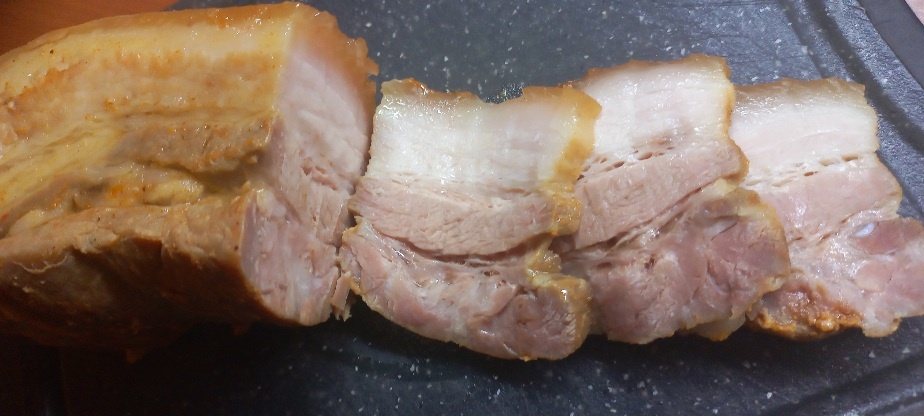 Ну а для завтрака убираем грудинку в холодильник. Я не удержалась, нарезала для бутерброда еще тёплую - кусочки получились не тонкие. Но очень вкусно! Приятного аппетита!