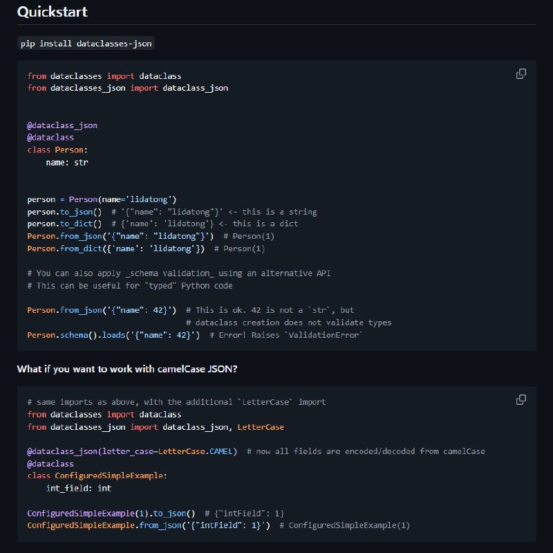⚒️ dataclasses-json — это Python-библиотека, которая упрощает сериализацию и десериализацию датаклассов в JSON и из JSON