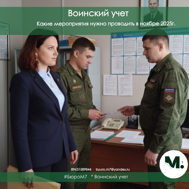 В ноябре 2025 года организации, ведущие воинский учет, должны проводить мероприятия, предусмотренные планом работы по воинскому учету и бронированию граждан, пребывающих в запасе, на 2025 год. Этот план разрабатывается на календарный год и согласовывается с военным комиссариатом муниципального образования до 31 декабря 2024 года.