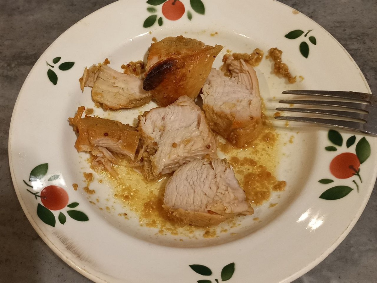 #индейка #грудка в дижонском маринаде, запеченная в рукаве. Маринад: На 1,5 кг филе грудки индейки Мед жидкий* - 4 ст.л. Горчица зернистая - 4 ст.л. Рафинированное подсолнечное масло - 2-3 ст.л. Чеснок - 2 зубца Концентрированный лимонный сок 1-2 ст.л. Сахар тростниковый - по желанию Соль, перец - по вкусу Куркума или карри - 1 ч.л *вместо меда можно использовать кулинарный соус на глюкозно-фруктозном сиропе типа Мирин Запекать ~ 1 час при 190° + 30-45 мин 160° при открытом рукаве, поливая соусом. Резюме: все равно суховата, несмотря на масло в маринаде. А вот красное мясо (бедро/голень) должно быть лучше. Рекомендации: запекать с овощами или беконом, мариновать дольше - от 2 суток, возможно стоит добавить немного соевого соуса.
