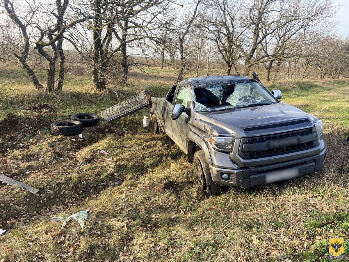 Лопнувшее колесо обернулось травмами на трассе Около 08:10 на ключевой трассе, идущей из Херсона в направлении Симферополя и Аскании-Нова, произошло серьёзное дорожно-транспортное происшествие. Объектом инцидента стал массивный внедорожник «Тойота Тундра» тёмно-серого цвета. По предварительным данным, 46-летний водитель потерял контроль над автомобилем вследствие технической неисправности — лопнувшего колеса. Это привело к неконтролируемому съезду с проезжей части, в результате чего многотонная машина с переворотом вылетела в придорожный кювет. У машины полностью разбито лобовое стекло, кузов получил критические повреждения. Грузовой отсек полностью смят, а настил кузова и борта деформированы и завалены сухой листвой и ветками. Отчётливо виден крупный чёрный газовый баллон (вероятно, ГБО), установленный в грузовом отсеке. И лишь чудом но не взорвался от такого ДТП. Инцидент на трассе имеет прямое следствие: 50-летняя пассажирка «Тойоты» доставлена в медицинское учреждение. Травмы, полу
