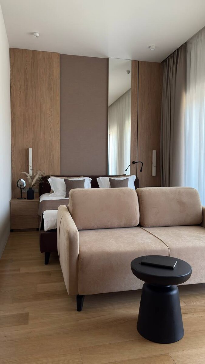 Зона спальни в апартаментах резиденции Mantera. Напомню, мы занимались комплектацией интерьера - доработкой ремонта от застройщика и наполнением мебелью, текстилем, аксессуарами. За изголовьем кровати спроектировали панели с подсветкой, вставку из обоев и зеркала. Подобрали лаконичные бра и светильник для чтения. Перекидное саше, подушки и портьеры - тоже на заказ. Кровать, диван - divan.ru Панели, тумбы - Bellini Текстиль - Comfocho Свет - Garda decor и Свет для вас Декор - Gilini