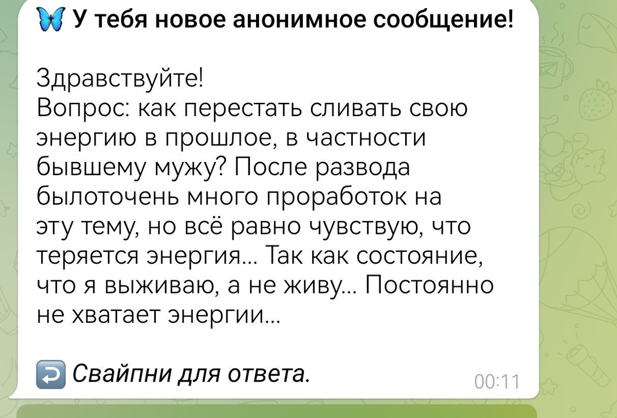 ОТВЕТ. Почему энергия уходит бывшему Даже после разводов, после работы с психологами и практиками, у многих остаются незакрытые энергетические каналы. Это происходит, если: – были сильные чувства, – были сексуальные связи (это всегда глубокая привязка), – были обиды, вина, недосказанность, -остались претензии, залипание – или если человек продолжает жить внутри вас как “тень прошлого”. -когда постоянные сравнения, сны, воспоминания Внешне всё закрыто, а внутри — нет. Как выглядит потеря энергии: – усталость без причины, – нехватка сил, – ощущение, что “живу в режиме выживания”, – невозможность расправить крылья. Причина проста: там, куда течёт внимание — туда течёт энергия. Если внутри осталась боль, недопрощённость — связь остаётся активной. Что делать: 1. Обрыв энергетических связей. Но не грубый, а мягкий, гармонизирующий. Грубые обрывы — травмируют и возвращают связь ещё сильнее. Выше в канале выкладывала ссылку на открытый курс Про отношения. 2. Возврат своей энерги
