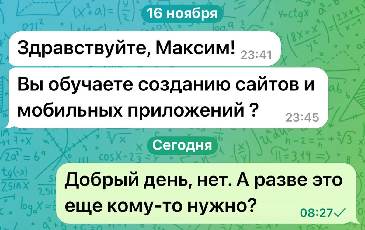 Я пытался отговорить человека, надеюсь удалось. Утром общался с товарищем, очень сильный программист (10+ лет опыта). Он ушел из ИТ в металлообработку, а точнее сборку из комплектующих из Китая электромотиков (под заказ). Уже есть заказы, доходность высокая, арендовали гараж большой и собирают... Говорит, что в гробу видел это ИТ :) - бабло в производстве. Русский ИТ бизнес