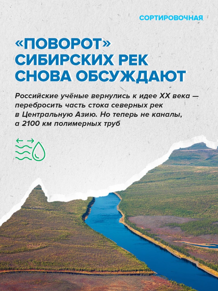 Российские учёные вновь обсудили идею советских времён — переброску части стока сибирских рек в Центральную Азию Проект предусматривает ежегодную подачу воды в засушливые регионы, но вызывает споры из-за возможного нарушения экосистем. 👆 В карточках показали, какие проблемы проект может решить и какие создать 👆 Сортировочная уже рассказывала про идею «поворота» сибирских рек: кто предложил её в СССР и чем она обернулась, а также другие попытки человечества обмануть природу. Подписаться на Сортировочную👍