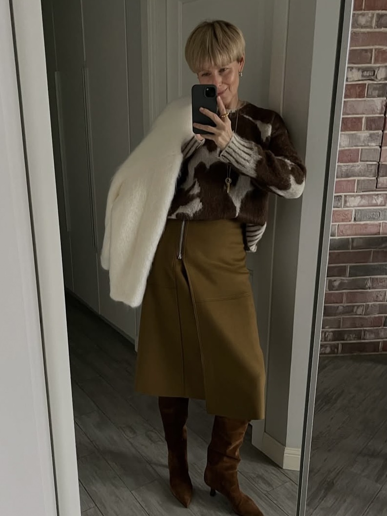 Зимний сезон 2025/2026 предлагает зрелым женщинам переосмыслить холодное время года как возможность для демонстрации утонченного вкуса и мудрого подхода к стилю. Современный гардероб для дам 55+ строится на принципах разумной достаточности, где каждая вещь сочетает эстетику, комфорт и функциональность. Основой зимнего гардероба становятся натуральные материалы с улучшенными терморегулирующими свойствами. Кашемир, хлопок, деним, шерсть с шелковой нитью, твид, вельвет, кожа и бархат. Эти ткани сохраняют тепло, позволяя коже дышать, и не утяжеляют силуэт. Крой изделий актуален в классических формах с акцентом на плечи или талию. Разрезы, асимметрия и воланы приветствуются. Пальто прямого кроя с поясом до середины икры или макси. Жакеты с обозначенной линией плеча и удлиненным силуэтом. Брюки с завышенной талией и плавным расширением к низу. Юбки с запахом или А-силуэта со складками. Каждый элемент подчеркивает достоинства фигуры, обеспечивая свободу движения. Шерстяной жакет носят
