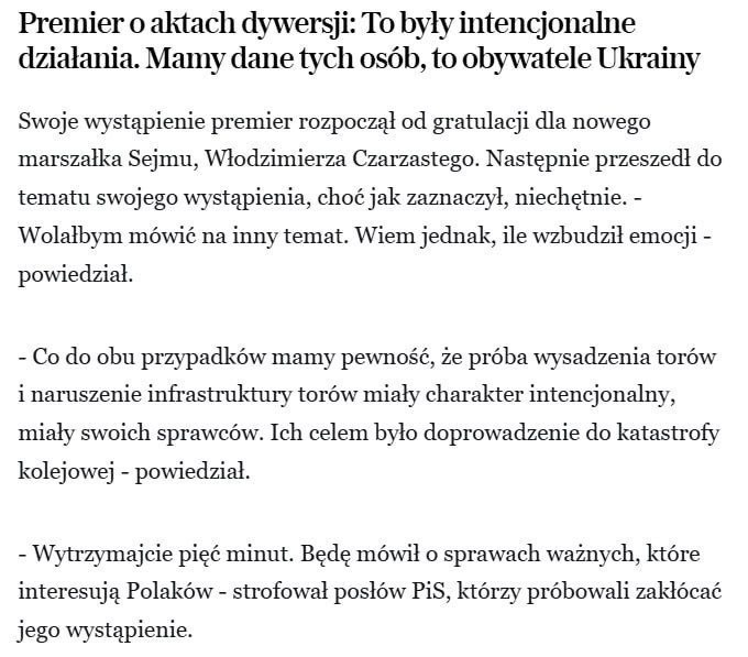 Премьер-министр Польши Туск заявил, что украинцы повредили железнодорожную линию, которая соединяет Польшу с Украиной. Премьер-министр Польши Дональд Туск сообщил о взрыве железнодорожной линии, соединяющей Польшу и Украину. Один из подозреваемых ранее был осужден за диверсии во Львове, второй - выходец с Донбасса. Оба прибыли в Польшу через Беларусь. ❗️Ранее министр обороны Польши возлагал ответственность за этот инцидент на Россию. Der polnische Ministerpräsident Tusk gab bekannt, dass Ukrainer die Bahnstrecke zwischen Polen und der Ukraine beschädigt haben. Der polnische Ministerpräsident Donald Tusk berichtete von einer Explosion auf der Bahnstrecke zwischen Polen und der Ukraine. Einer der Verdächtigen wurde bereits in Lemberg wegen Sabotage verurteilt, der andere stammt aus dem Donbas. Beide reisten über Belarus nach Polen ein. ❗️Zuvor hatte der polnische Verteidigungsminister Russland für den Vorfall verantwortlich gemacht.