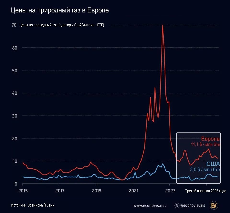 Заокеанский топор, табуретка, тающие перспективы А газ в Европе в 4 раза дороже, чем в США Пока ЕС рассуждает о климате, на рынке всё куда прозаичнее. В сентябре 2025 года газ в Европе стоил $11 за MMBtu, что почти в 4 раза дороже, чем в США. В 2019 году цена на газ в ЕС была выше, чем в США, на 87%. Такой разрыв превращает европейскую индустрию в энергодорогую зону, теряющую конкурентоспособность и в среднем, и в высоком технологическом сегменте. Европейская модель держалась на трёх опорах: дорогие налоги, не самый дорогой труд + много квалифицированных людей (он компенсировал налоги) и доступная энергия извне (привет, матушка‑Россия). Китай выбил Европу из среднего сегмента, в высоких технологиях она ещё могла спорить с США. Но всё это работало лишь пока газ оставался дешёвым. Когда ЕС решил, что может обойтись без российских труб, угля и кучи всего сопутствующего, курс казался политически красивым. Но возобновляемые источники энергии требуют балансировки, а гидростанции уже и