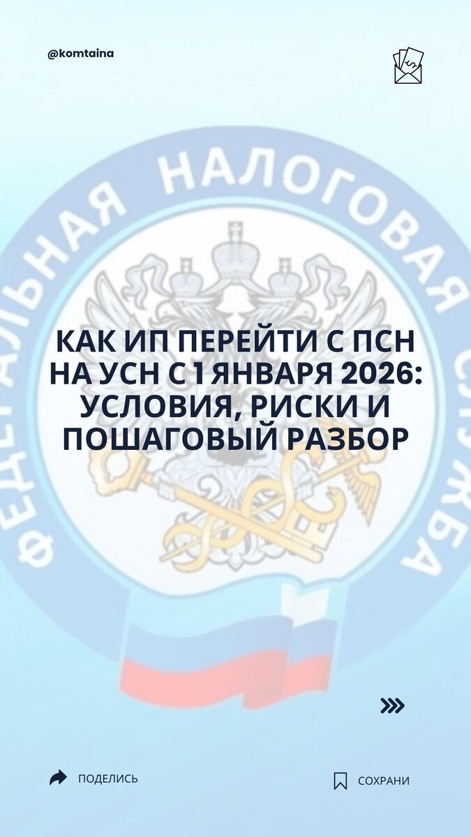🛍 Как ИП перейти с ПСН на УСН с 1 января 2026 года: условия, риски и пошаговый разбор С 2026 года индивидуальным предпринимателям придётся учитывать серьёзные изменения. Всё больше бизнесов вынуждены переходить с патентной системы налогообложения на упрощённую. В материале — детальное руководство: когда и как перейти, какие риски и ошибки чаще всего встречаются, и как пройти процесс без штрафов и с минимальными потерями. 👉 Benefitsar НДС — проверенные вычеты, сопровождение, защита от рисков. Переходите за консультацией специалистов: @supernewna_bot @komtaina