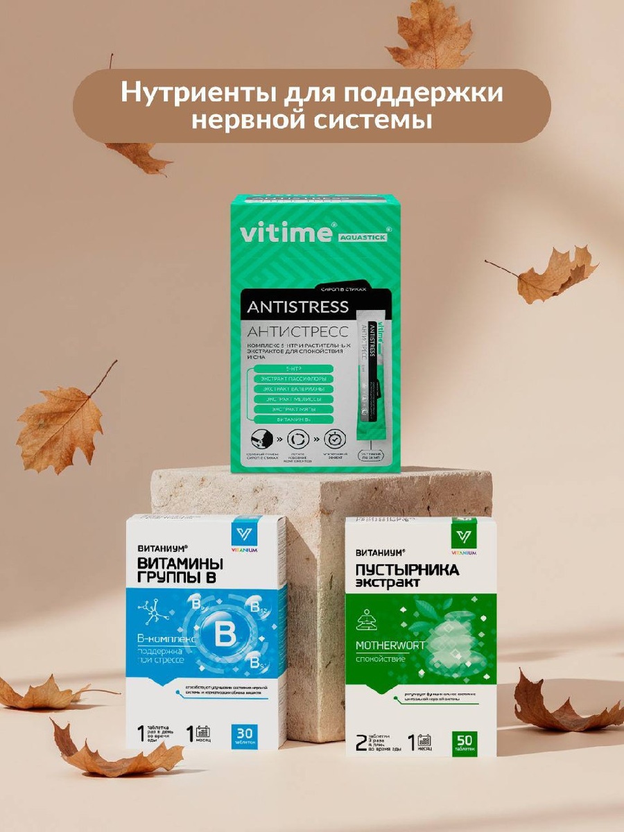 🍂 Осенью нервная система сталкивается с серьезными испытаниями: стресс, нехватка солнца, перепады настроения и усталость становятся привычными спутниками. Поддержать организм изнутри помогут витамины, минералы и растительные экстракты, которые мягко стабилизируют эмоциональное состояние и сохраняют спокойствие. Сегодня расскажем о трех продуктах для комплексной поддержки в периоды высоких нагрузок 👇 🌙 VITime® Aquastick® Antistress — комплекс в удобном формате сиропа в стиках. Биодоступные формы компонентов + жидкая форма = ускоренное действие. 5-НТР + растительные экстракты + витамин В6: • участвуют в выработке серотонина и мелатонина; • успокаивают, снижают тревогу, улучшают качество сна. Когда полезен комплекс: при стрессе, хронической усталости, тревоге и нарушениях сна. 🧠 Витамины группы В Витаниум® — 7 витаминов в 1 таблетке • Улучшают работу мозга, память, внимание и работоспособность. • Участвуют в синтезе серотонина, дофамина и мелатонина. • Повышают стрессоустойчи