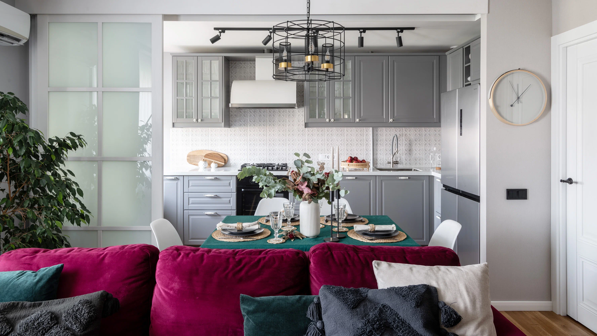 Неудобную геометрию кухни спасла раздвижная перегородка во всю стену — теперь в квартире есть удобная кухня-гостиная, где все могут собраться за большим столом. При этом кухня остаётся отдельным помещением — перегородку можно закрыть в любой момент.