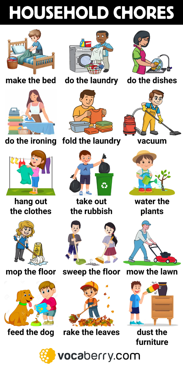 Here’s a list of common household chores, their meanings, and how to use them in sentences.