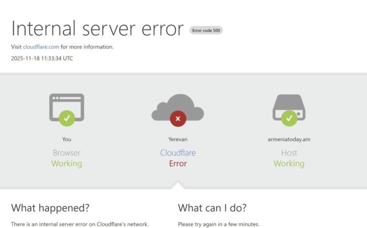 Сервис Cloudflare отчитался о полном восстановлении работы своих серверов. В данный момент веб-сайты в Армении и по всему миру открываются без проблем. «Исправление было выполнено, и мы считаем, что инцидент решен. Мы продолжаем отслеживать ошибки, чтобы убедиться, что все сервисы работают в штатном режиме», — говорится в сообщении мониторингового сайта Cloudflare. Сегодня днем в работе сервиса Cloudflare произошел масштабный сбой. Проблемы выражались в невозможности загрузки веб-сайтов, доступа к серверам и полной недоступности множества интернет-ресурсов, использующих эту инфраструктуру. Сбой в работе сервиса быстро распространился на платформы, использующие инфраструктуру Cloudflare для поддержания связи. Проблемы возникли с доступностью интернет-сервисов Х, Spotify, некоторые сообщали о недоступности ChatGPT и игр Epic Games. Из-за сбоя практически все новостные сайты в Армении перестали открываться. О проблемах с подключением сообщали также пользователи из США, России, Германии, Т