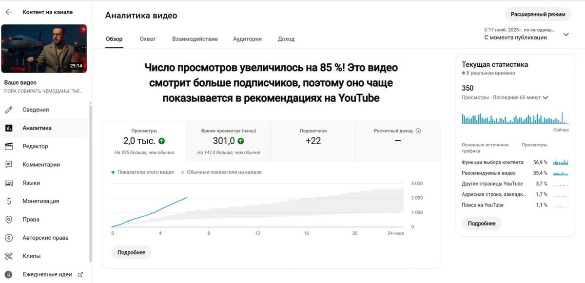 🔥 Итоги первой половины ноября — YouTube радует Продолжаю делиться результатами: трафик и доходность во второй половине ноября меня более чем устраивают. RPM держится стабильно высоким, просмотры идут, а монетизация отрабатывает отлично. Это ещё раз показывает: YouTube жив, YouTube работает, и YouTube даёт деньги тем, кто понимает, что снимать. 🎯 На что делаем упор сейчас? Наша основная задача — производить больше качественного, удерживающего контента, особенно в рамках серийных направлений. Логика простая: ✔️ Если ролики заходят на постоянных зрителей → отрабатываем тему до упора, пока она даёт результат. ✔️ Если начинает проседать → тестируем новые форматы и свежие серийные направления. YouTube Analytics прекрасен тем, что даёт нам точные подсказки. Мы смотрим: 🔹 самый популярный контент за последние 90 дней, 🔹 что лучше всего возвращает зрителей (вкладка «Аудитория» → «Новые вернувшиеся зрители»), 🔹 какие темы дают качественный трафик и удержание. На основе этого и двиг