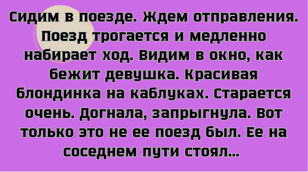 - Наблюдаю сцену: ссорятся парень с девушкой. Она красиво одета, в руках цветы. Доорались до того, что она — такая волосы назад — и ушла в конец вагона. Парень совсем отчаялся и кричит, мол, выходи за меня! А она: «Да иди ты лесом!» И вот прямо в этот момент у нее как ломается шпилька — это поезд резко затормозил. Это знак.