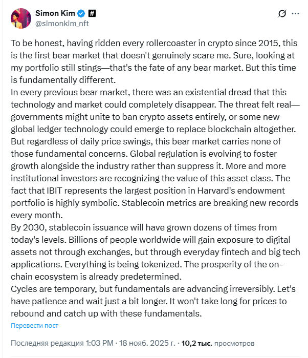 Генеральный директор Hashed: Честно говоря, проехав на всех американских горках криптовалюты с 2015 года, это первый медвежий рынок, который меня действительно не пугает. Конечно, смотреть на свой портфель всё ещё больно — такова судьба любого медвежьего рынка. Но на этот раз всё принципиально иначе. В каждом предыдущем медвежьем рынке присутствовал экзистенциальный страх, что эта технология и рынок могут полностью исчезнуть. Угроза казалась реальной — правительства могли объединиться, чтобы полностью запретить криптоактивы, или могла появиться новая глобальная технология реестра, которая заменит блокчейн. Но независимо от ежедневных колебаний цен, этот медвежий рынок не несёт в себе этих фундаментальных опасений. Глобальное регулирование развивается так, чтобы способствовать росту вместе с индустрией, а не подавлять её. Всё больше институциональных инвесторов признают ценность этого класса активов. Тот факт, что IBIT представляет собой крупнейшую позицию в портфеле эндаумента Гарварда