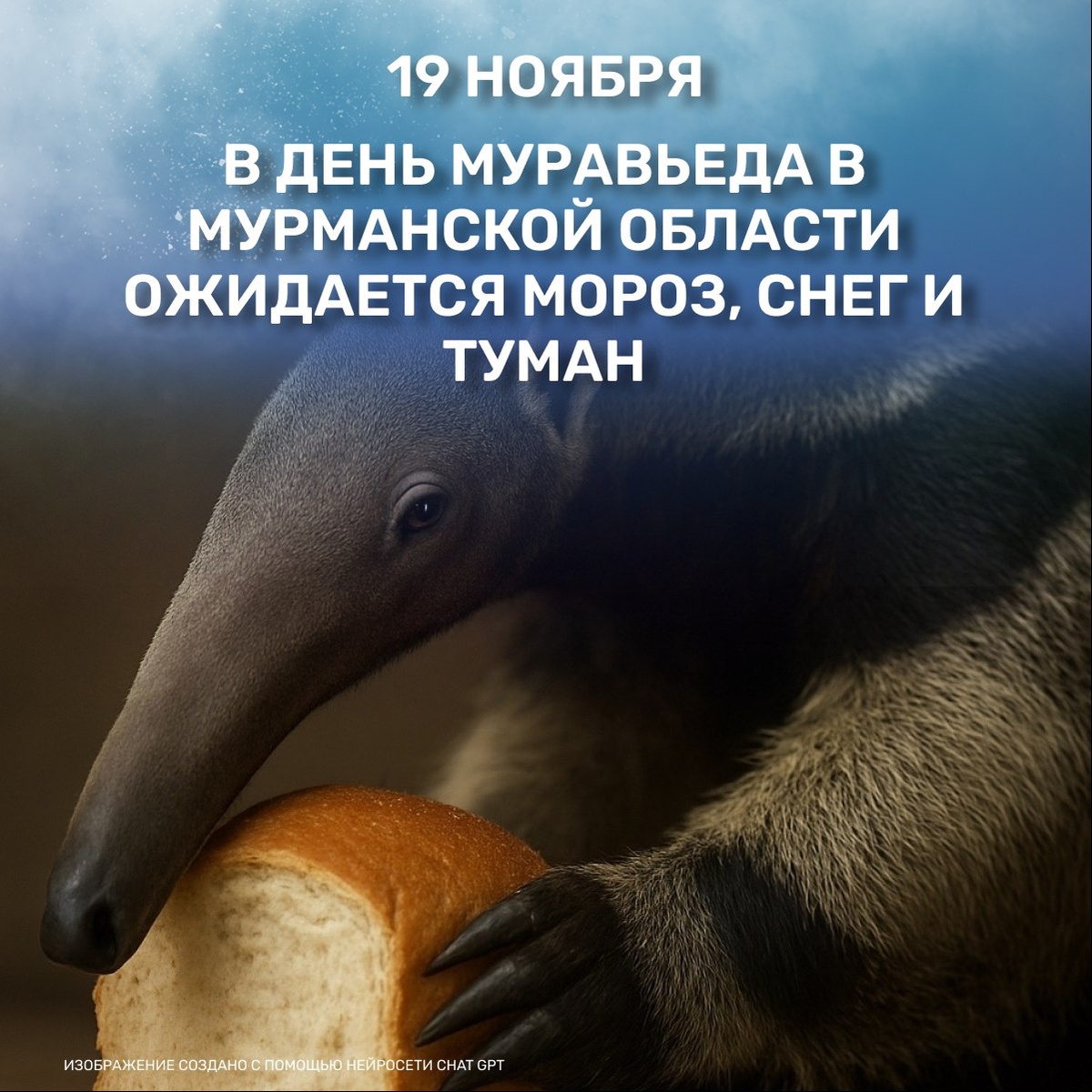 ☃️В Кольском Заполярье 19 ноября, в День муравьеда и День запаха свежего хлеба, ожидается облачная с прояснениями погода. Местами снег, изморозь, туман. Ветер юго-западный, западный умеренный. Температура воздуха ночью от -9 до -14 градусов Цельсия, при прояснениях -18…-23, днем -3…-8, местами до -15. Гололедица. 🐾19 ноября — День муравьеда. Язык этих животных достигает 60 сантиметров в длину и покрыт липкой слюной. Благодаря этому муравьеды с легкостью достают из узких тоннелей муравьев и термитов — свою основную пищу. 🍞А еще 19 ноября — День запаха свежего хлеба, напоминающий нам о простых радостях жизни. Наверняка у многих аромат только что испеченного хлеба вызывает чувство уюта, тепла и безопасности.