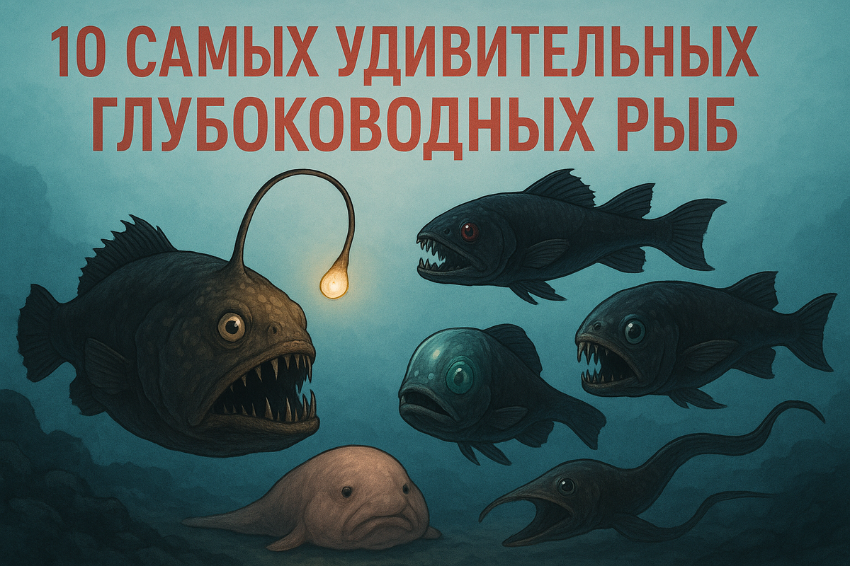Мир океанских глубин — это одно из самых загадочных мест на Земле. Там, где нет солнечного света, где давление огромно, а температура близка к нулю, живут удивительные существа, будто сошедшие со страниц фантастических книг. Ниже — десять самых поразительных глубоководных рыб, которые поражают своим внешним видом и способностью выживать в таких условиях. Это, пожалуй, самая известная жительница глубин. На её голове растёт длинный "удилище" с биосветящейся лампочкой на конце. С помощью этого фонарика рыба заманивает добычу прямо в огромную пасть с острыми зубами. Самки значительно больше самцов, а сами самцы живут как паразиты, буквально сливаясь с телом самки. Интересный факт: свет в "лампочке" создают особые бактерии, которые живут внутри рыбы. Эта рыба похожа на существо из кошмаров — длинное тело, огромные зубы и глаза, светящиеся в темноте. Самки имеют светящиеся усики, а вот самцы — крошечные, без зубов и вообще не едят: они живут за счёт запасов, полученных при рождении