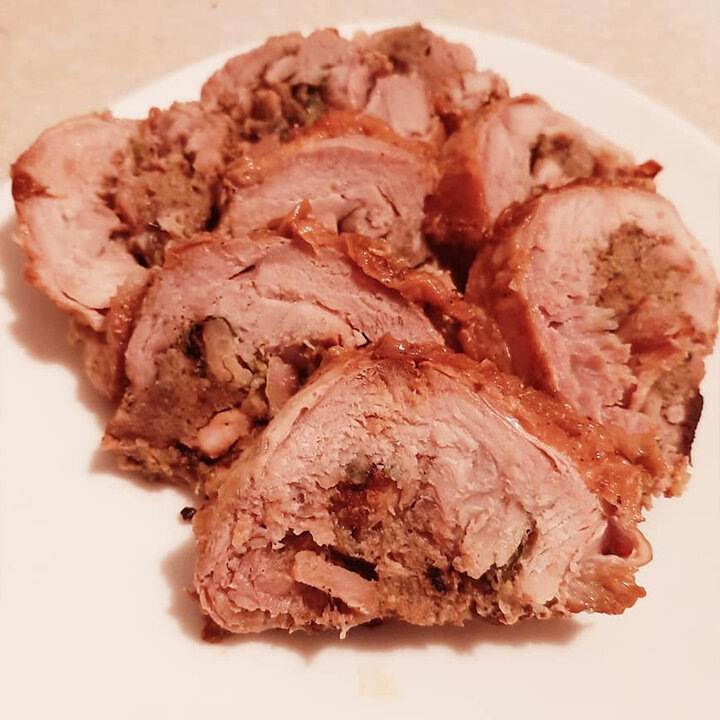 Это блюдо подаётся и горячим, и холодным - трудно сказать, как вкуснее. ✔ Голень индейки без кости - 600 г (2 шт. по ~300 г); ✔ Масло растительное - 1 ст. л.; Для начинки: ✔ Бекон (сырой, несоленый) - 70 г; ✔ Хлеб ржаной - 100 г; ✔ Лук - 1 шт.; ✔ Шампиньоны свежие - 150 г; ✔ Яйцо - 1 шт.; ✔ Зелень петрушки – 5-10 г; ✔ Сметана 20% - 100 г (для тушения). Из голеней вырезаем кость и освобождаем от сухожилий, слегка отбиваем. Начинка может быть любой. Можно делать начинку из печёнок, грибов, овощей. У меня сегодня фарш из кусочка рижского хлеба, луковицы, кусочка бекона, шампиньонов, зелени петрушки и сырого яйца. Всё, кроме зелени и яйца припустить на сковородке с ложкой раст. масла, смешать с остальными ингредиентами, посолить, поперчить и выложить на подготовленное мясо. Кладём начинку, сворачиваем, обвязываем нитками, а если голень крупная, то просто зашиваем. Быстро обжарить на сильном огне, положить сметану, влить немного воды, убавить огонь и тушить до готовности. Подавать горячим