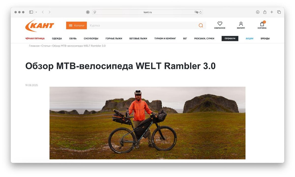 Еще в конце лета писал статью об опыте катания на Welt Rambler 3.0. Классный базовый хардейл, на котором можно спокойно отправляться в адекватные горные походы, кататься в формате ПВД или быстро проезжать лесные маршруты. Читать тут - https://www.kant.ru/articles/obzor-mtb-velosipeda-welt-rambler-3-0/ Помимо статьи рекомендую обратить на товары в подборке, ну и конечно не забыть про промокод velofil, который дает скидку до 20% в зависимости от бренда при заказе в интернете или на кассе магазинов сети Кант.