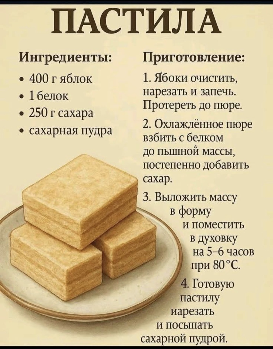 Домашняя пастила — это тот случай, когда всего три ингредиента превращаются в идеальный, лёгкий и натуральный десерт. Ароматная, нежная, сладкая — дети обожают, взрослые спрашивают рецепт, а ты знаешь, что внутри только яблоки и ничего лишнего. --- 🍏 Ингредиенты: Яблоки — 400 г Белок — 1 шт. Сахар — 250 г Сахарная пудра — для посыпки 👩🍳 Как приготовить пастилу: 1. Подготавливаем яблоки Очистите, нарежьте и запеките до мягкости. Горячие яблоки протрите в пюре — можно через сито или блендером. 2. Взбиваем основу Охлаждённое яблочное пюре взбейте с белком до пышной воздушной массы. Постепенно всыпайте сахар, не прекращая взбивать. 3. Запекаем пастилу Выложите массу в форму ровным слоем и отправьте в духовку на 5–6 часов при 80°C. Пастила должна подсохнуть, но остаться мягкой. 4. Финальный штрих Остуженную пастилу нарежьте полосками или кубиками и посыпьте сахарной пудрой. ✨ Советы: Для яркого вкуса можно добавить немного ванили или корицы. Хотите более плотную кон