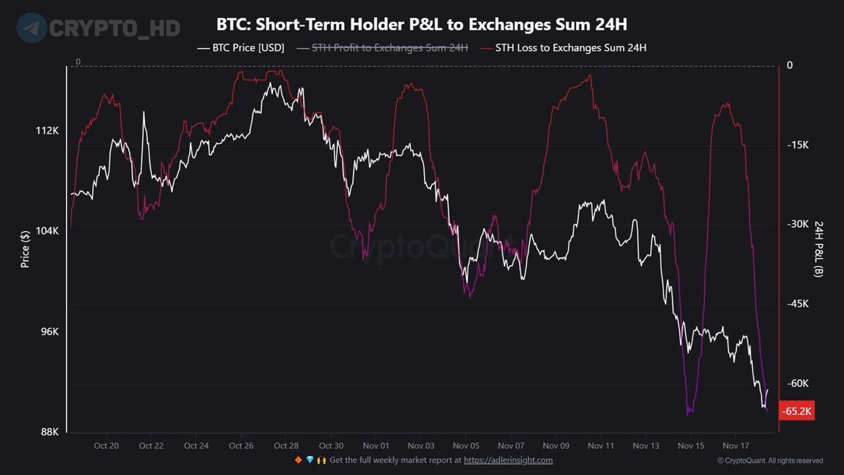 #ончейн 😐 CryptoQuant: За 24 часа краткосрочные холдеры продали 65,200 BTC ($6b) в убыток. Индикатор STH Loss to Exchanges Sum 24H отражает объем BTC краткосрочных держателей, отправленный на биржи в состоянии нереализованного убытка. Метрика фиксирует именно перевод, а не фактическую сделку. Тем не менее, вывод средств на биржу обычно указывает на подготовку к продаже, поэтому часть BTC, вероятно, уже была продана, а часть может находиться в ожидании продажи. Cryptо Headlines