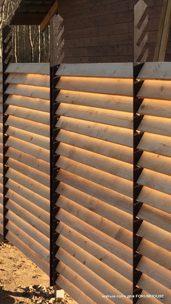 Забор от подписчика FORUMHOUSE: - Здравствуйте, форумчане! Хотел бы поделится своим опытом изготовления забора. Не скажу, что он принципиально нов, но кое-что интересное в нем есть. Все используемые материалы и технологии для его изготовления доступны и вполне бюджетные. Все началось с того, что меня принципиально не устраивали предлагаемые рынком сегодня разные виды заборов. По разным причинам, и финансовым и эстетическим. Ни забор из профнастила, ни каменный, ни простой деревянный забор по совокупности факторов не ложились на душу. Было принято решение сделать самостоятельно 90 метров забора по типу "жалюзи". Глядя на стоимость разного вида заборчиков Большая Зеленая Жаба принципиально не хотела тратить денег на странного вида конструкции предлагаемых стандартных заборов. Особенно в ступор вводили профнастилы. Все начиналось как обычно с картинки в инете. Далее в голове возник чертеж, перенос на бумагу, расчет материалов и погнали... 1. Столбы железные 3 м, грунтуем целиком, в землю
