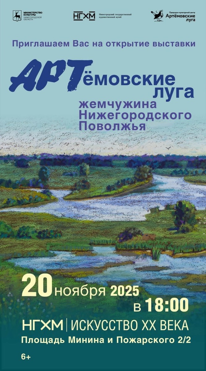 Приглашаем на открытие выставки «Артемовские луга – жемчужина Нижегородского Поволжья» ✨ 20 ноября 2025 года в 18:00 в НГХМ | ИСКУССТВО ХХ ВЕКА состоится вернисаж выставки «Артемовские луга – жемчужина Нижегородского Поволжья. Экспозиция станет итогом масштабного проекта «Лугов Артёмовских рассветы и закаты», в рамках которого прошла серия пленэров с целью привлечения внимания к уникальному природному объекту и формирования живописной летописи о жизни жемчужины нижегородского Поволжья- Артемовских лугах. С 2024 года в летний период художники работали на территории лугов, создавая произведения в разных техниках: масло, акрил, акварель, гуашь, пастель, темпера, карандаш, уголь. Авторы не ограничивались приятными прогулками по живописным окрестностям природного объекта, выбирая мотив в комфортном для себя ритме. Творческая компания энтузиастов выезжала в труднодоступные уголки Артёмовских лугов. Следуя строгому графику проекта, они стремились передать разнообразие окружающего мира — от