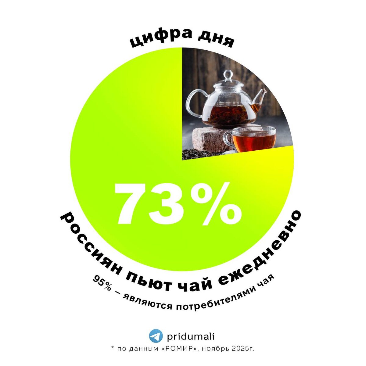 РОМИР оцифровал российского чаелюба, больше всего чая пьют женщины и люди в возрасте от 35 лет В рубрике «Цифра дня» данные РОМИР — 73% россиян пьют чай ежедневно. Анализ показал, что чай воспринимается россиянами прежде всего как семейная категория, а также ассоциируется с добротой, надёжностью и простотой. Причём, абсолютная доля потребителей чая в России по данным — 95%. 👉подписаться на @pridumali #исследования