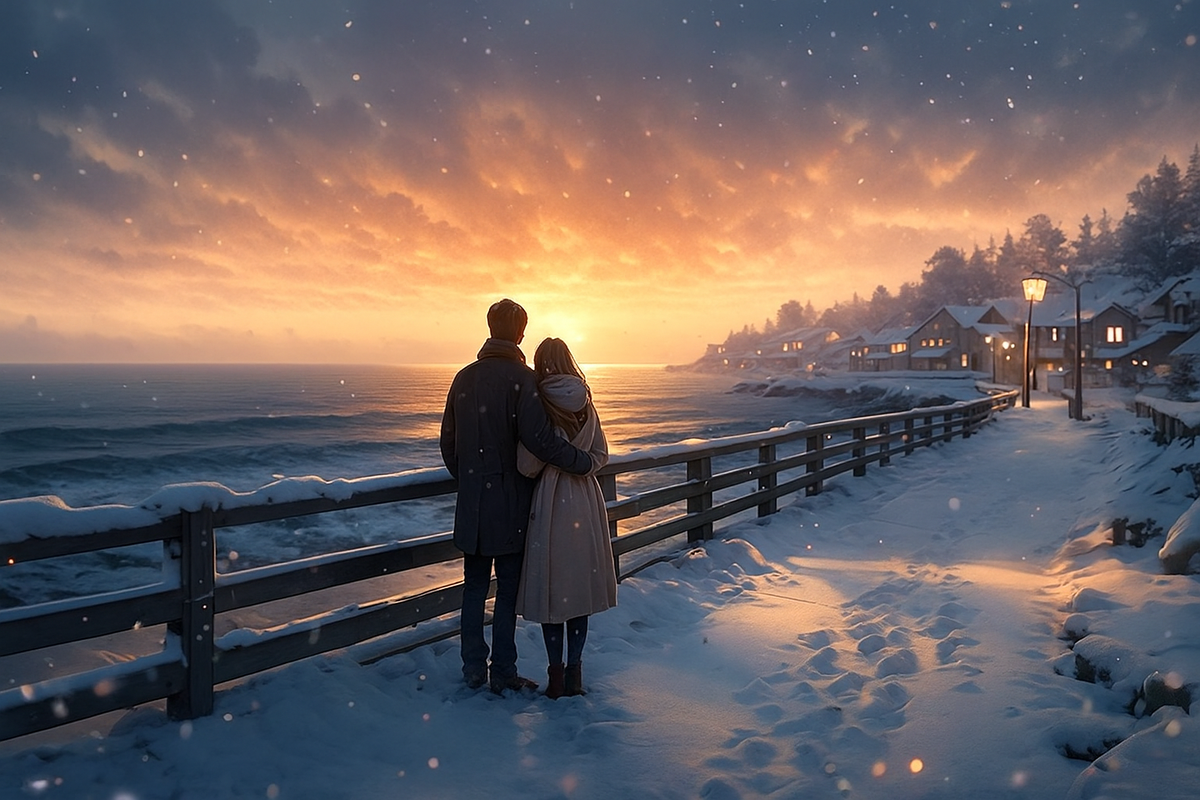 Снег выпал неожиданно. Город стал белым и мягким, как будто кто-то накрыл его пледом. Мы гуляли вдоль берега, и море казалось ещё спокойнее, чем обычно.