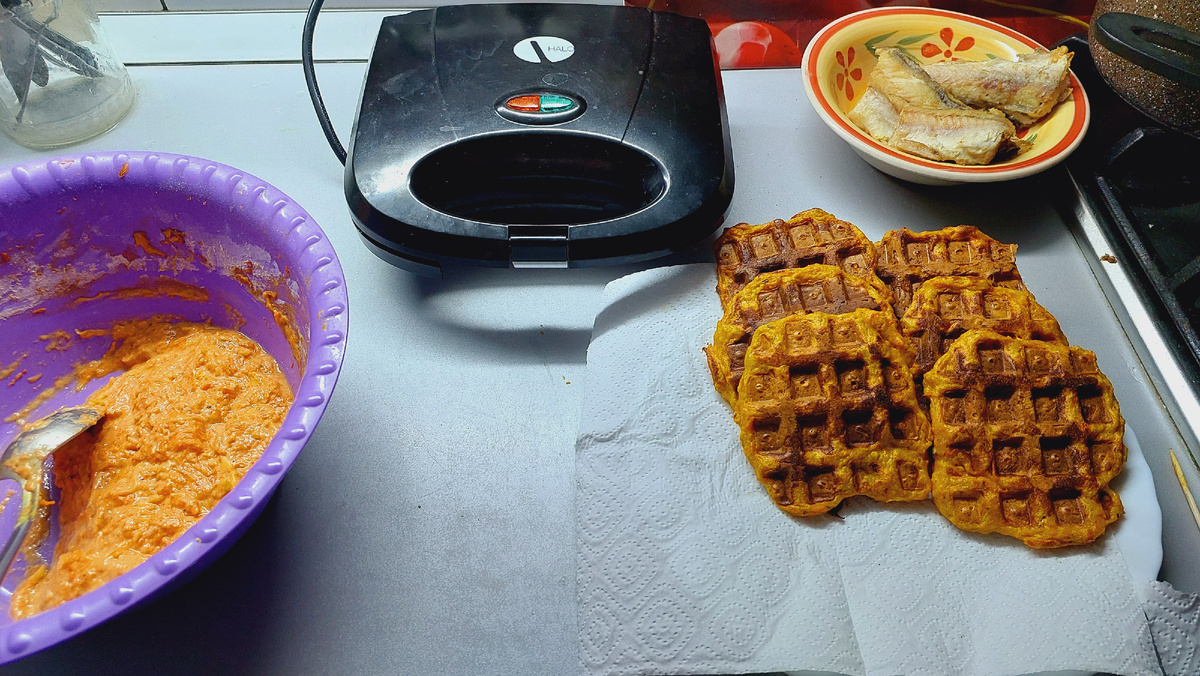 Да,и это так.Приготовила я тесто для вафель,заодно пожарила рыбу.Тут же все,рядышком.Заложила вафли первые,и ушла в зал ,на свое место кушать.Поела,сижу,прошло минут я думаю 30-40,сижу,и вдруг дошёл запах,я вспомнила что вафли у меня же там!? На кухню захожу,не дыма,не гари никакой нет.Открываю вафельницу, а там все норм,просто сильнее зажарились ,стали хрустящие,но не сгорели. Вот там первые,вверху,они и есть.ну и конечно потом доделала ка положено.А все знаете почему так получилось.Я когда закладываю тесто,выхожу в зал,где я сижу на любимом кресле,и говорю Алисе,10мигут таймер,а тут -забыла!? Так что все обошлось,все допекла,с приправа,вкусные вафли.Я пеку не сладкие.Почему то не даёт писать дальше. Не знаю,что то не так пошло.Про то что произошло,ничего не известно,все друг у друга спрашивают,и ничего нового.Но говорят у них света нет 2 дня уже.Вообщем что узнаю,напишу. Вот такой обед был.Вкусно мне было.Утром гречкас молоком,а на обед с рыбой,кому как,а мне было вкусно.А вообще я