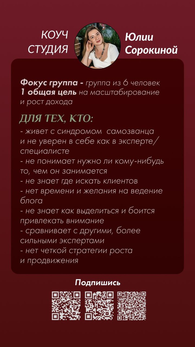 Я вижу своей миссией помогать начинающим экспертам и предпринимателям строить устойчивую, доходную деятельность, в которой нет предательства себя, нет выгорания, а каждый шаг приносит радость и удовлетворение. И я знаю, как сложно к этому прийти в одиночку. Ведь не у всех есть поддержка и опора. Я знаю, как часто не хватает взгляда со стороны и коллективного мозгового штурма. Я знаю как часто не хватает сфокусированности на цели. И поэтому... Я приглашаю вас в 2 месячную фокус группу, с моим полным погружением в ваш проект. Вас ждёт: - индивидуальная стратегическая сессия со мной, - 8 групповых созвонов, на которых будем отслеживать прогресс к цели и корректировать путь её достижения, - тёплый чат поддержки. Вся подробная информация указана в слайдах. Если у вас остались вопросы, хотите узнать подробности и записаться, пишите 👉 @sorokina_juliya