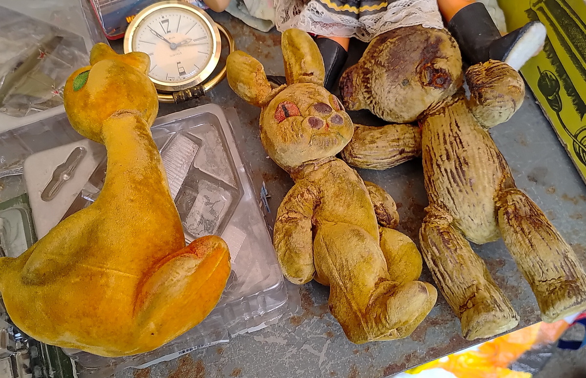Среди хлама и сокровищ мой взгляд выхватил прилавок, где не могли обрести покой три потёртые флокированные игрушки СССР. Гусь, заяц и медведь. Гусь был самым сохранным из них, в то время как зайца и медведя время не пощадило. В прошлом они, вероятно, были довольно милыми созданиями. А красноглазый ушастик в годы его юности, может быть, выглядел не таким злобным (но это не точно).