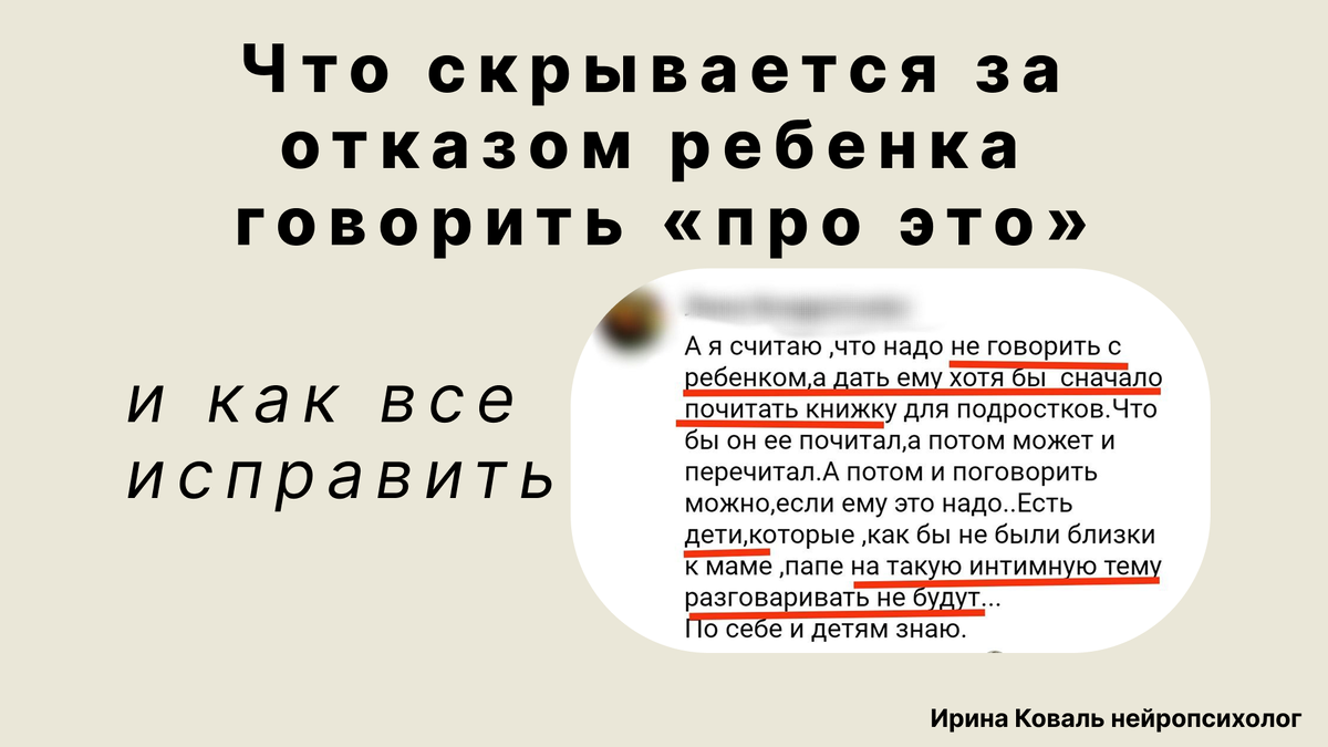 «А я считаю, что надо не говорить с ребенком, а дать ему сначала почитать книжку для подростков... Есть дети, которые, как бы ни были близки к маме, папе, на такую интимную тему разговаривать не будут...» ❓Почему ребенок не хочет говорить? 1️⃣ Часто родители сами создают «стену» интонацией, мимикой и своим отношением: «У моей мамы было изменившееся лицо, она была вся напряженная, с приторно-ласковым и серьезным тоном… Меня это встревожило. Дети в первую очередь реагируют на невербалику. Фраза "Нам надо поговорить на деликатную тему" означала, что я точно откажусь». Если вы заранее нервничаете, ребенок считывает ваше состояние как сигнал, что сейчас будет что-то страшное и стыдное. И его отказ - это инстинктивная защита от дискомфорта. 2️⃣ Бывает, что разговор начинается не вовремя: ребенок погружен в игру, озадачен проблемами в школе или просто устал. Ваше «нам надо поговорить» для него - это внезапное нарушение его границ и еще одно «ты должен». Поэтому его естественная реакция - отто