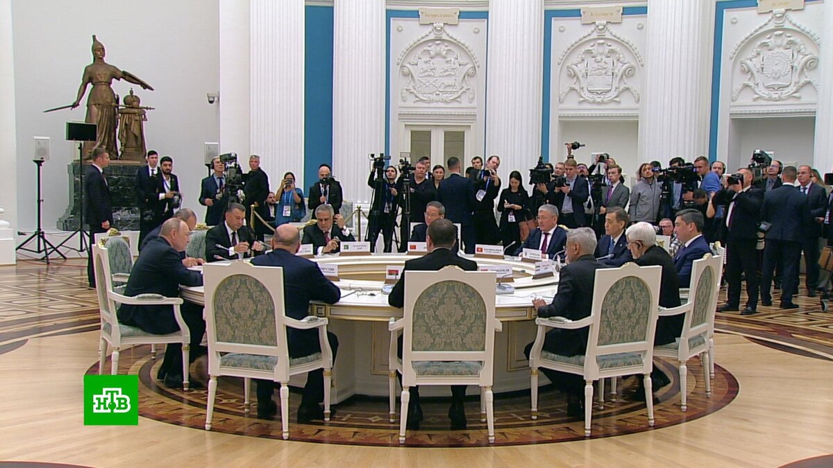 [ Смотреть видео на сайте НТВ ] Будущее Евразии стало сегодня главной темой больших переговоров в Кремле. В Екатерининском зале Владимир Путин встретился с главами Совета правительств государств Шанхайской организации сотрудничества. В ходе дискуссии были затронуты темы, которые в условиях постоянного давления извне и односторонних санкций стоят на повестке ШОС особенно остро. Созданная на рубеже веков Шанхайская организация сотрудничества на первых этапах всего лишь координировала усилия нескольких стран по вопросам приграничной безопасности, а сейчас ШОС — мощнейшее объединение. 65 процентов территории Евразийского континента, половина населения земного шара, три мировые экономики, входящие в первую пятерку — Россия, Китай, Индия. Владимир Путин, президент РФ: «У нас одна цель — повысить авторитет ШОС как крупнейшего регионального объединения. И правительствам принадлежит особая роль по практической работе». Сейчас страны ШОС прорабатывают совместную концепцию развития до 2035 года.