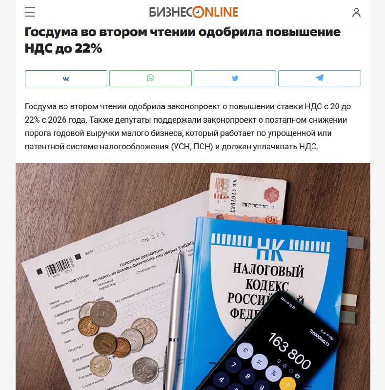 🇷🇺 Госдума одобрила повышение НДС до 22% и новые налоговые меры Во втором чтении принят законопроект о повышении ставки НДС до 22% при сохранении льготных 10% для социально значимых товаров. Также депутаты поддержали введение 7% налога для букмекеров — с разницы между ставками и выигрышами — и ужесточили налоговый режим для иноагентов, установив для них единую ставку НДФЛ в 30%.