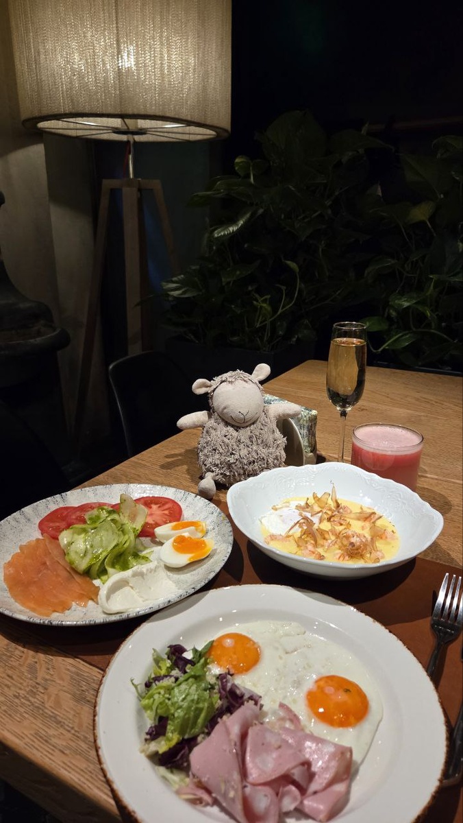 Следующее утро было прекрасно! Солнце, голубое небо, легкий морозец. Красота! Вылезать из мега-комфортной постели совсем не хотелось. Но утреннюю лень победило чувство голода. Пора на завтрак! Долг зовет! Его здесь сервируют с 8 до 12, и до 13 в выходные. Стоимость 2650 руб./чел. Из меню можно выбрать 2 любых блюда + 2 любых напитка, включая отечественное игристое вино. Овце Борису не успокаивается, хочется попробовать – всё! Заказали Завтрак №2 – лосось со свежими овощами и яйцом всмятку. Входящую в состав фокаччу – забыли(( Полента с лососем и яйцом пашот вызвала недоумение - странное сочетание сильно сладкой каши с очень соленым лососем и жидкое яйцо. Сильно на любителя странностей. Правда подача запредельная! Из-за температуры каши, обсыпка рыбными лепестками ожила! Каша выглядела блюдом из фантастических фильмов. А вот Глазунья была прекрасно во всём! По-домашнему и с любовью. #MYS