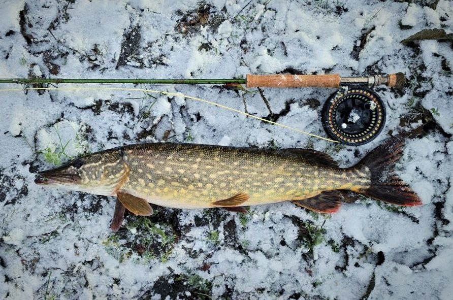 Съездили на выходных половить щуку на одно известное озеро на Карельском перешейке. В итоге поймали одну трёшку, одну полторашку и две килограммовые на четверых. Собирались на Вуоксу или Ладогу, но дул крепкий ветер, и на больших водоёмах нам бы не поздоровилось, решили поехать на лесное озеро. На воду вышли в 11:30, не очень рано, но нам хватило. Деревья стояли белые от иния, на земле лежал снег. Температура воздуха была 0…-1, и на ветру вода быстро превращалась в лёд. Кольца обледенели, подсачек замерзал сразу же, как его доставали из воды, баллоны катамаранов тоже покрылись коркой льда. Зимняя рыбалка — она такая. Сначала клевало не очень, первую рыбу поймали через час после начала. Щука просто повисла и практически не сопротивлялась при вываживании. Сработала муха — тёмно-зеленый верх, низ шартрез, на крючке 4/0, достаточно крупная. Потом череда вялых поклёвок, и уже перед закатом рыба взбодрилась и стала реагировать на коричнево-жёлтую муху. Были поклёвки, сходы, достаточно ве
