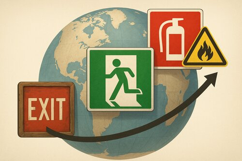 До середины XX века каждая страна пользовалась собственными системами визуального оповещения. США применяли текстовые красные сигналы EXIT, европейские страны использовали зелёные или белые указатели, а в ряде азиатских государств использовались графические коды, не предполагающие пиктограмм в привычном для нас виде. В условиях задымления такие различия становились критичными: текстовые надписи теряли читаемость, а непоследовательность формы создавали ошибки в интерпретации направления выхода. Анализ крупных пожаров продемонстрировал необходимость перехода от локальных систем к интернациональному набору символов, ориентированному на мгновенное распознавание.
