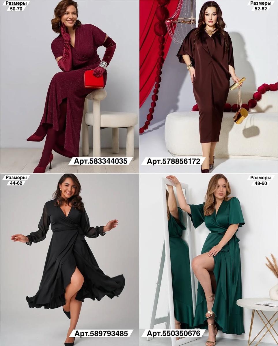 Эта коллекция — настоящий гид по праздничным платьям, которые создают настроение, подчеркивают женственность и дарят уверенность в новогоднюю ночь. Все модели идут строго по порядку, как на фото, с подробным описанием и рекомендациями стилиста. 1. Вишнёвое платье с перчатками — Арт. 583344035 (размеры 50–70) Эффектное платье насыщенного вишнёвого оттенка создаёт настроение роскоши. Лёгкое мерцание ткани делает образ праздничным, а мягкая драпировка и асимметричный низ визуально вытягивают силуэт. Очень элегантная модель, в которой каждая женщина чувствует себя уверенно. Совет стилиста: сочетай с длинными перчатками в тон и миниатюрной сумочкой — получится благородный винтажный образ. 2. Шоколадное платье с запахом — Арт. 578856172 (размеры 52–62) Мягкий атласный блеск, аккуратный запах и прямой силуэт делают платье универсальным и невероятно стильным. Шоколадный оттенок подчеркивает тон кожи, создавая тёплый и дорогой образ. Совет стилиста: подбери золото — крупные серьги или браслет,
