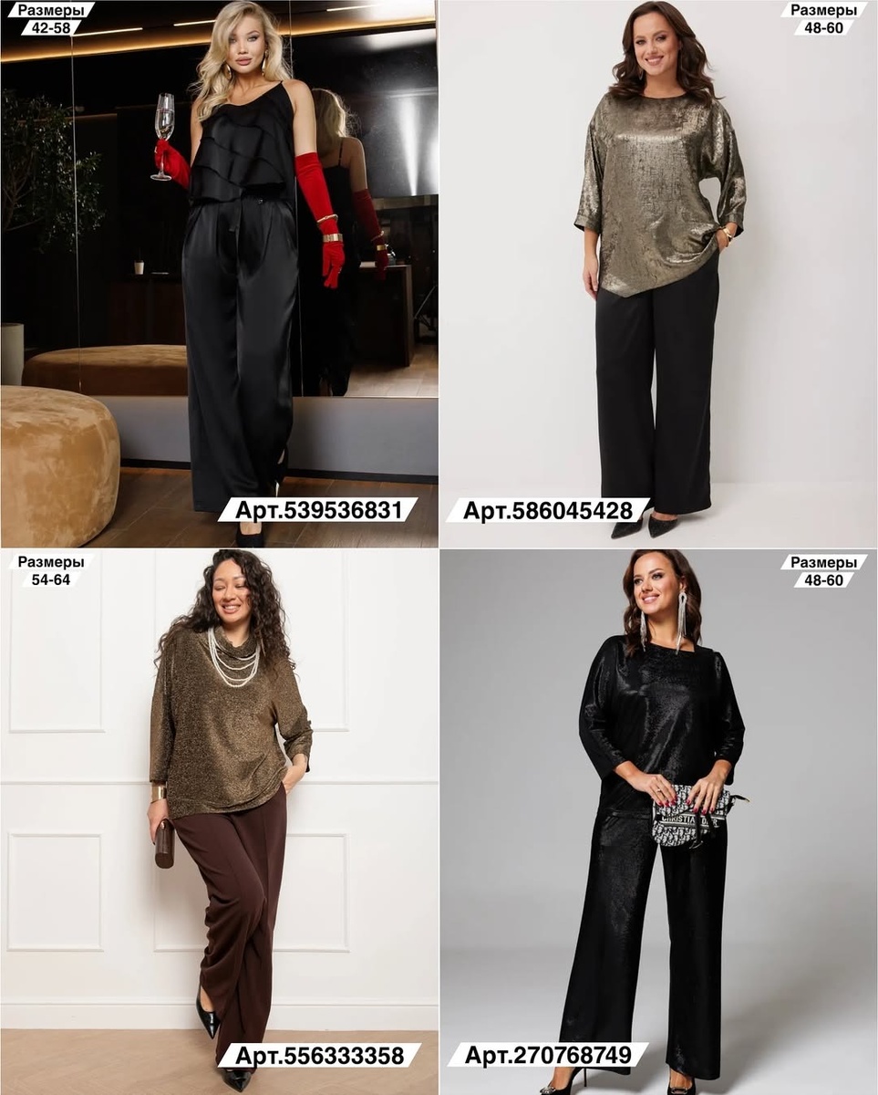Праздничные вечера — это время сиять, чувствовать себя уверенно, женственно и невероятно красиво. Эта подборка — идеальный ориентир для тех, кто ищет роскошные, стильные и при этом комфортные новогодние образы. Все модели идут строго по порядку, как на фото, с подробным описанием и советами стилиста. 1. Элегантный чёрный комплект с воланами — Арт. 539536831 (размеры 42–58) Нежный, чувственный образ с акцентом на лёгкую струящуюся ткань. Воланы на топе создают многослойность, а прямые брюки вытягивают силуэт. Наряд выглядит дорого, эффектно и подойдёт как для ресторана, так и для домашнего праздника. Совет стилиста: сочетай с длинными перчатками или массивными украшениями — образ станет кинематографичным. 2. Золотистая блестящая блуза + чёрные брюки — Арт. 586045428 (размеры 48–60) Свободный крой и мягкое сияние ткани делают комплект идеальным для вечеров. Металлический блеск красиво подчеркивает тон кожи, а широкие брюки гармонируют с блузой. Совет стилиста: добавь крупные серьги и об