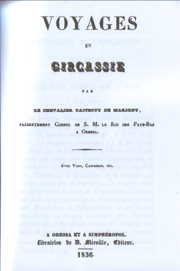 Примечательно, что сами черкесы называют себя лишь именем «адыге», следов которого не видно среди тех, что передали нам античные историки. Племена, обитающие за Кубанью вплоть до высочайших гор Кавказа, а также населяющие побережье, принадлежат к трём разным народам: черкесам, абазам и татарам; я полагаю, что только абазы живут от Кубани до Сухум-Кале; их имя обнаруживается в названии древних абасгов, а имя черкесов должно, вероятно, происходить от названия керкетов, и, возможно, что Натухайцы ведут своё происхождение от ахейцев. Аппиан Александрийский утверждает, что последние были греками, которые upon возвращении из-под Трои были заброшены бурей в Понт Эвксинский, где сильно пострадали от варваров; и что, послав некоторые из своих кораблей на родину, они были там плохо приняты и изгнаны, что привело их в такую ярость, что они переняли обычай скифов приносить в жертву всех иностранцев, высаживавшихся на их берег. Сначала они приносили в жертву всех без разбора, затем выбирали самого красивого, и, наконец, жертву назначал жребий.
