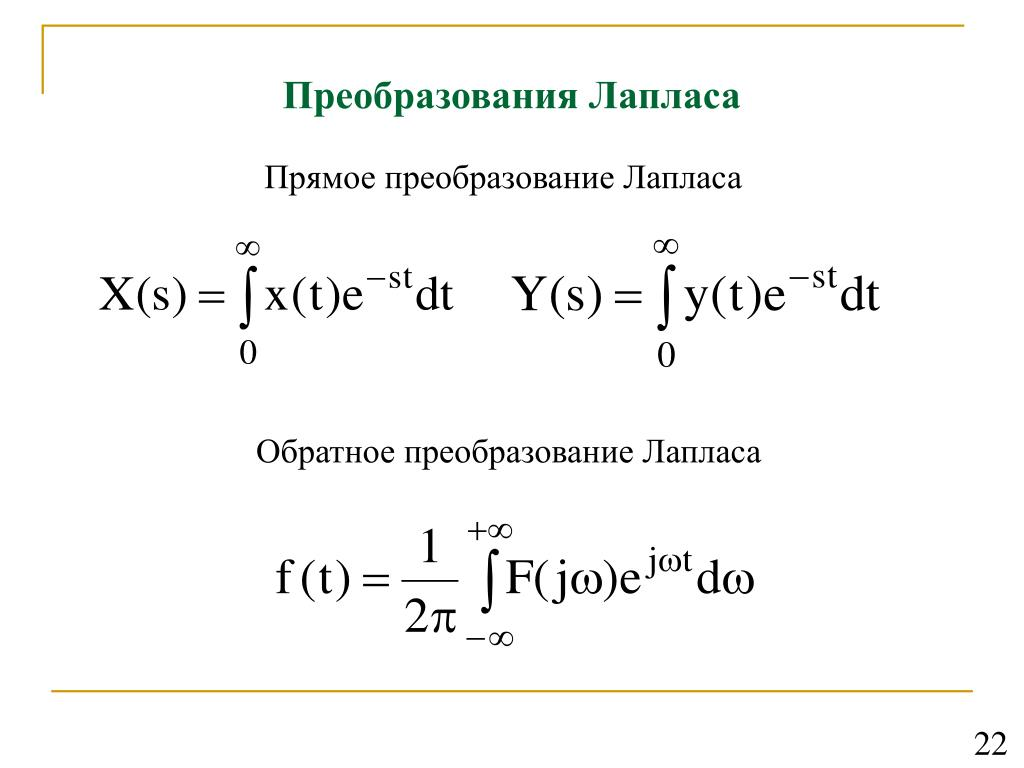 Преобразование Лапласа — интегральное преобразование, которое связывает функцию F(s) комплексного переменного (изображение) с функцией f(t) вещественного переменного (оригинал). ru.ruwiki.ruru.wikipedia.org*leonidov.suВыделяют прямое и обратное преобразования Лапласа. ru.ruwiki.rulib.qrz.ru