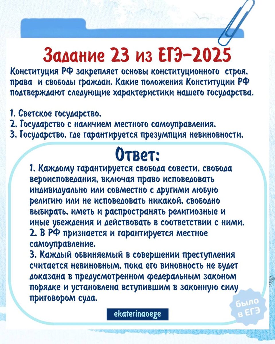 🔊🔊🔊🔊🔊 Карточка с ответом для задания 🤝🤝из реального 🤝🤝🤝⬇️🤝👍🤝🤝 1️⃣ Конституция РФ закрепляет основы конституционного строя, права и свободы граждан. Какие положения Конституции РФ подтверждают следующие характеристики нашего государства. 1. Светское государство. 2. Государство с наличием местного самоуправления. 3. Государство, где гарантируется презумпция невиновности. 🖐👉👆 Каждое подтверждение должно быть сформулировано как распространённое предложение с опорой на конкретное положение Конституции РФ. Правильное выполнение задания не требует указания в ответе номеров соответствующих статей Конституции и дословного воспроизведения их содержания. Запоминайте материал и делитесь с одноклассниками! Пригодиться может каждому👍 И не жалейте 🔥